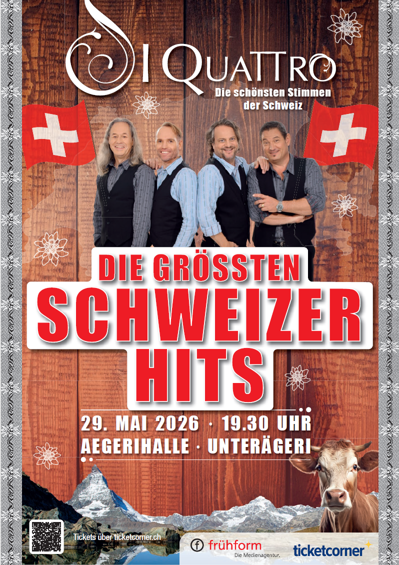 Ein Revival der erfolgreichen SRF Fernsehshow mit I QUATTRO – die schönsten Schweizer Hits live und exklusiv in der AEGERIHALLE Unterägeri.